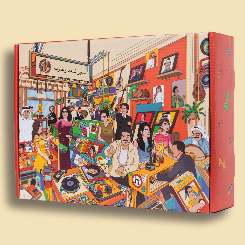 تعتلي البوكس لوحة فنيّة مرسومة لعدد من الفنانين وهم يقومون بجولة تسوّق في متجر نسعد ونطرب ويظهر عليهم الإنبهار من أناقة منتجاته.